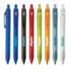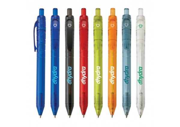 Recycled plastic push-action pen with a recycled symbol printed on clip.  Made with 80% recycled materials from plastic water bottles.