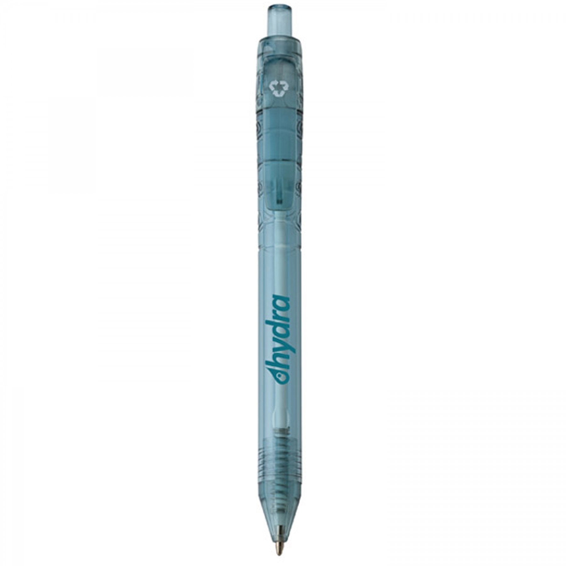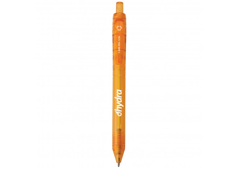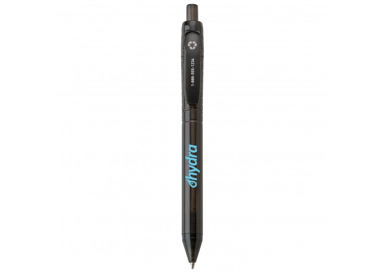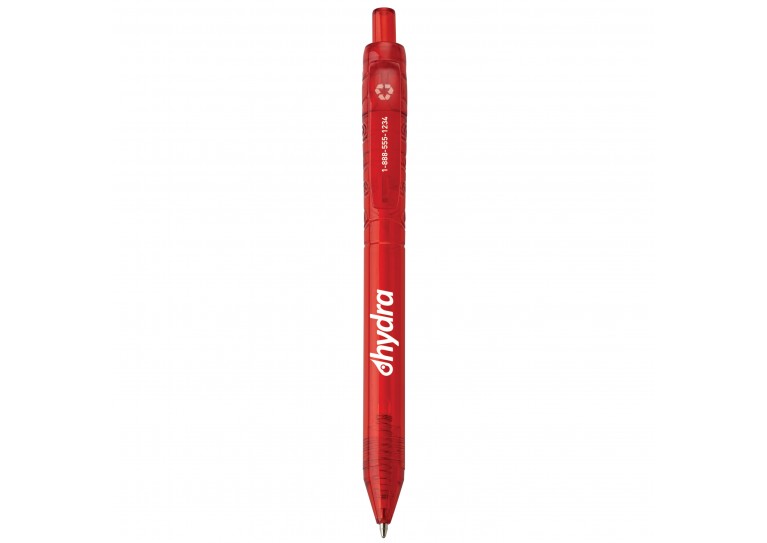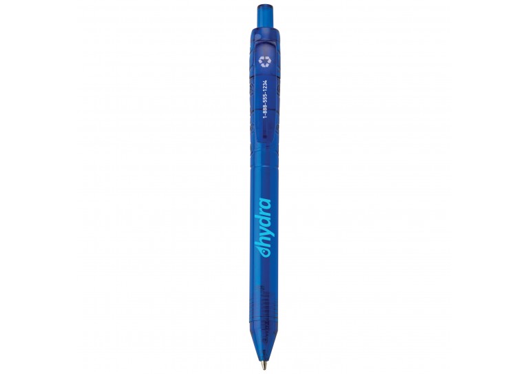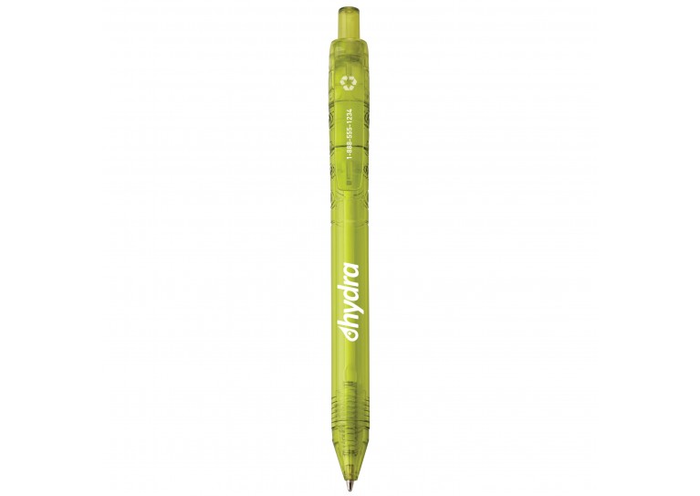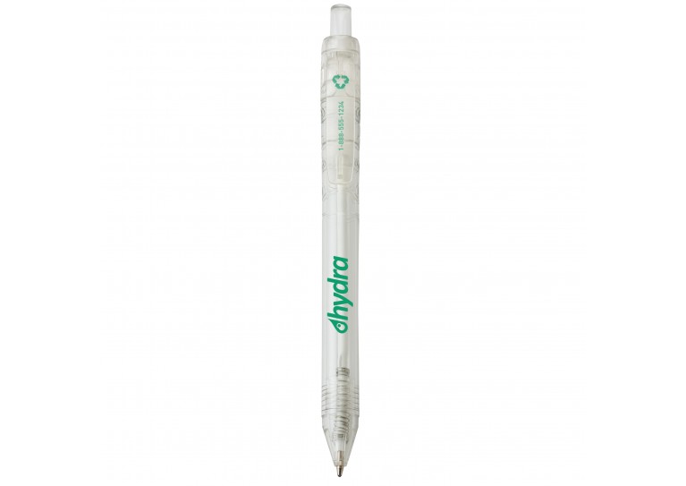 Recycled plastic push-action pen with a recycled symbol printed on clip.  Made with 80% recycled materials from plastic water bottles.
